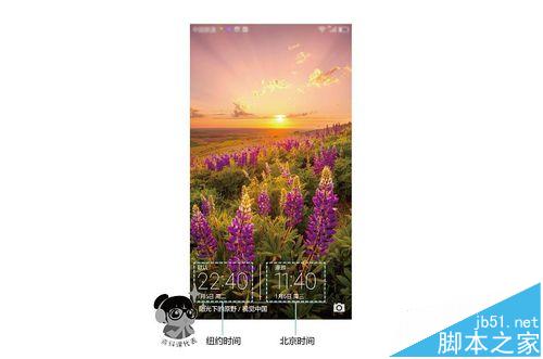 开启双时钟后,锁屏状态点亮屏幕,即可在桌面左下方看到纽约时间,右下方看到北京时间。