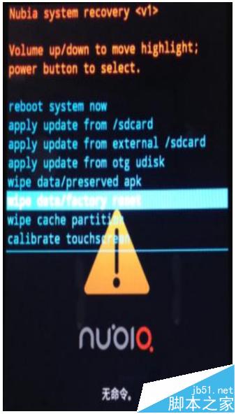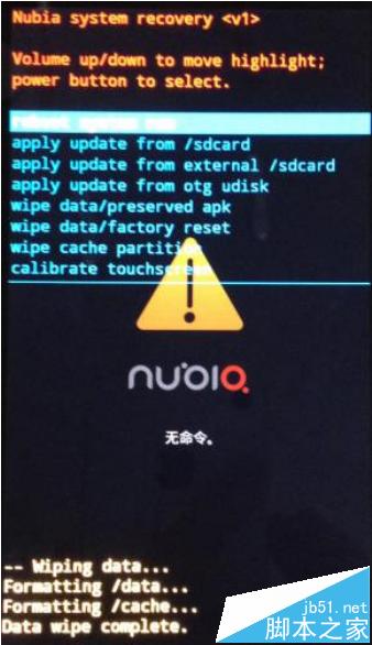 4、手机会执行“恢复出厂设置”操作,然后手机会回到Recovery的主菜单,使用电源键选中“ reboot system now” 行,手机会自动重启,恢复出厂设置完毕。