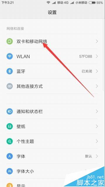 3、在打开的手机设置主界面,选择“双卡和移动网络”菜单项