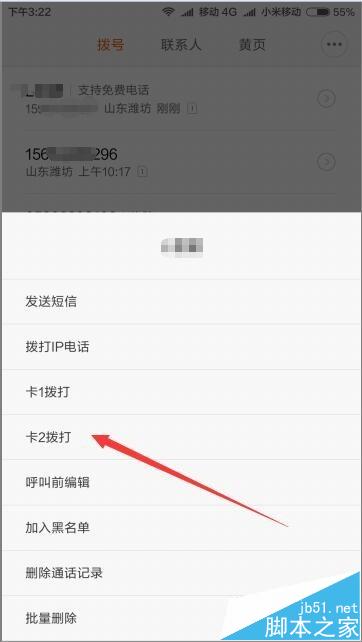6、如果我们想使用卡2拨号怎么办呢,也没有必要重新设置,只需要长按要拨打号码一小会,然后在弹出的菜单中选择卡2拨打即可