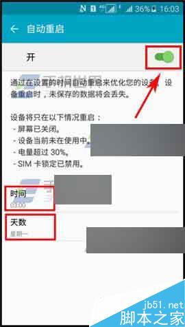 2)打开后我们再点击【自动重启】,接着把开关打开,最后还可点击时间和天数进行调节重启频率。(如下图)