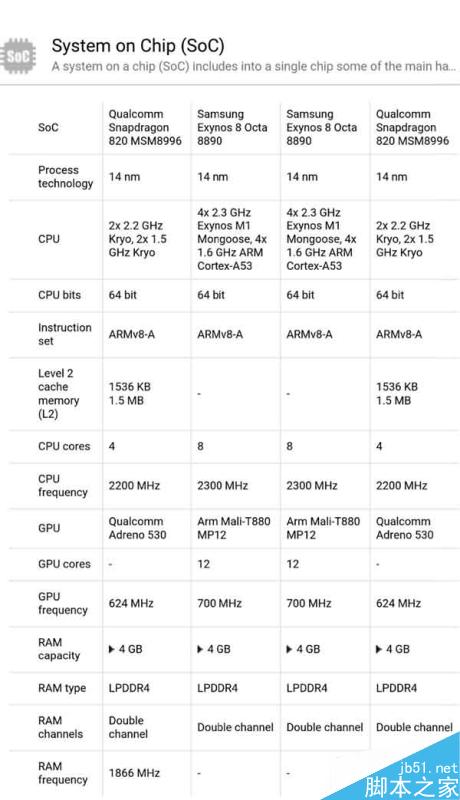 - 处理器:三星Exynos 8890,14nm工艺,四个大核Exynos M1 2.3GHz/四个小核Cortex-A53 1.6GHz,整合GPU Mali-T880MP12 700MHz;高通骁龙820,14nm工艺,1.5MB二级缓存,两个大核Kryo 2.2GHz/两个小核Kryo 1.5GHz,整合GPU Adreno 530 324MHz