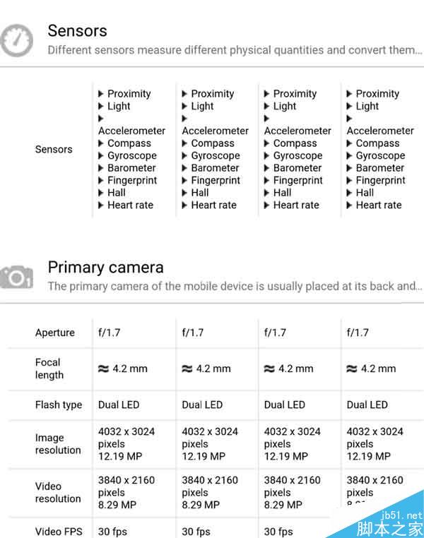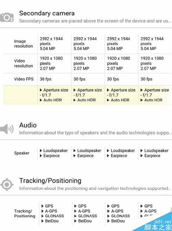 - 前置摄像头:500万像素,F/1.7光圈,拍照最大分辨率2592×1944,视频最大分辨率1080p/30fps