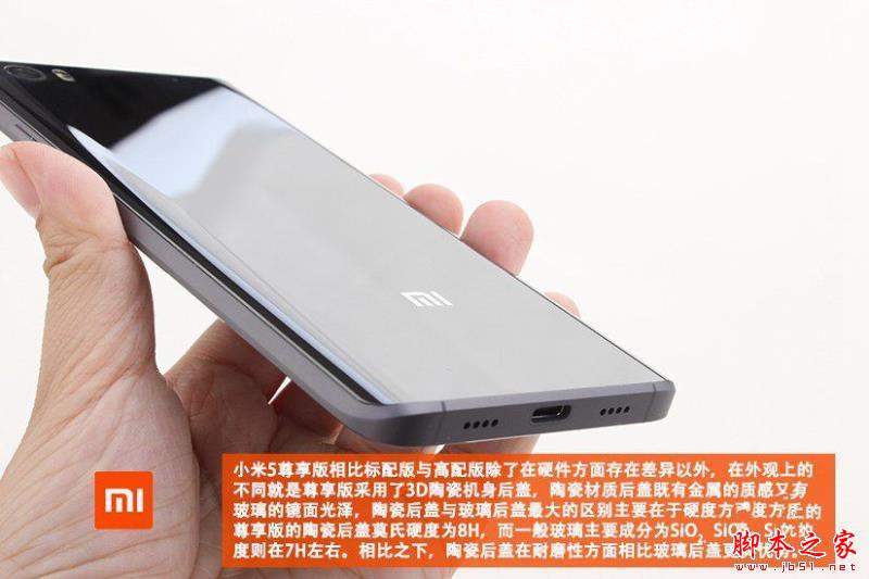 小米5尊享版采用的是高强度的陶瓷机身,相比标准版/高配版的玻璃机身有所不同,材质档次更高。