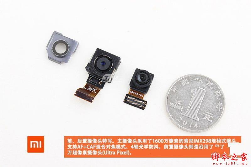 图为拆卸下来的小米5尊享版前后双摄像头特写,主摄像头为1600万像素,副摄像头为400万像素。