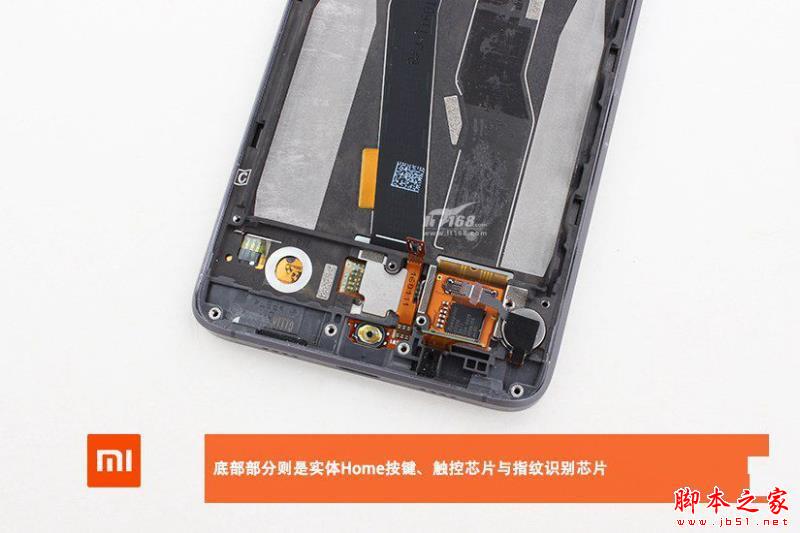 图为小米5尊享版内部集成指纹识别的Home键特写。