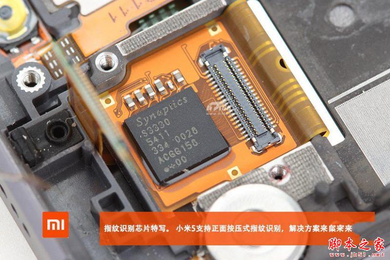 指纹识别芯片特写。小米5支持正面按压式指纹识别,解决方案来自Synaptics。