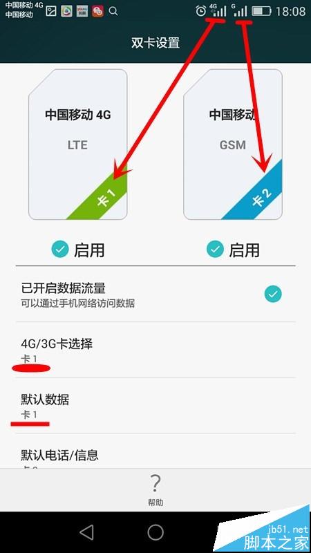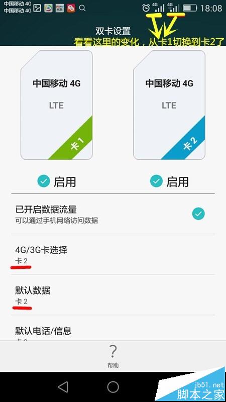 7、设置完成,请看【默认数据】和【4G/3G卡选择】下方已经显示为卡2,然后看顶部两个卡的网络图标已经换上变化,卡1的数据已经关闭,卡2的数据已经连接。