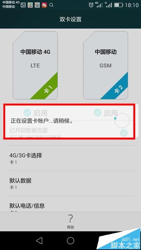 4、进入双卡设置界面,注意看顶部两个卡的网络显示图标和下面默认数据,图中为卡1。