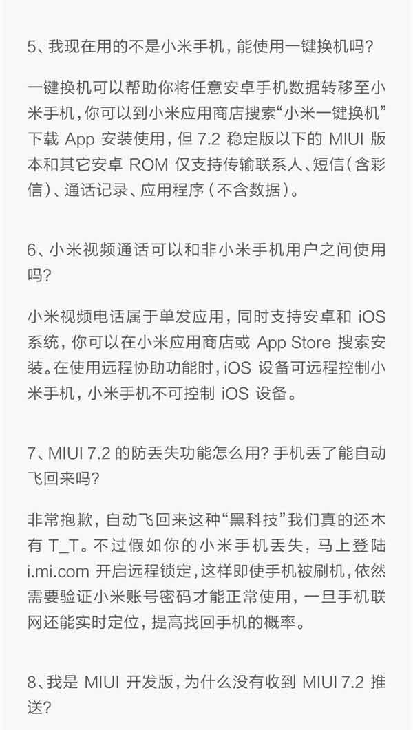 根据小米官方公告,MIUI 7.2首批支持8款机型,分别是小米手机5、小米手机4S、小米Note顶配版、小米手机4c、小米手机3移动版、小米平板1代、红米Note 以及红米手机1S(联通3G/电信3G)。
