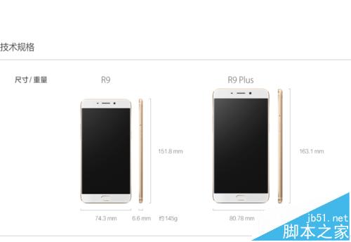 OPPO R9:5.5寸屏幕,尺寸151.8mm×6.6mm×74.3mm,重145g。