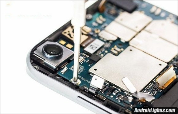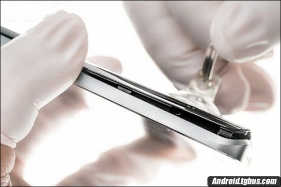 第二步:拆机从后盖入手。小米5采用双面玻璃+金属边框设计方案,其中小米5玻璃后盖采用的是卡扣式设计,拆解比较简答,只要使用吸盘拉起后壳即可比较轻松的将后盖拆卸下来,如图所示。