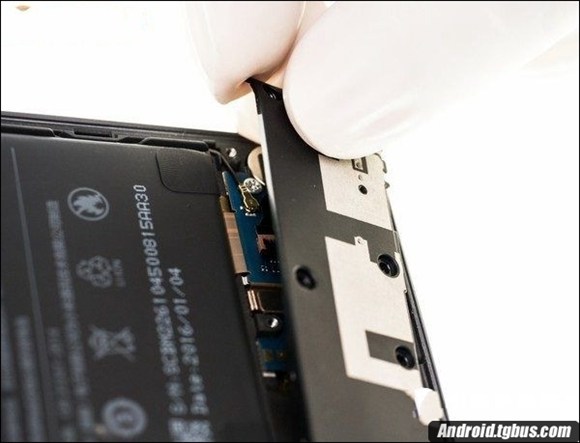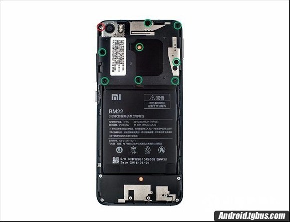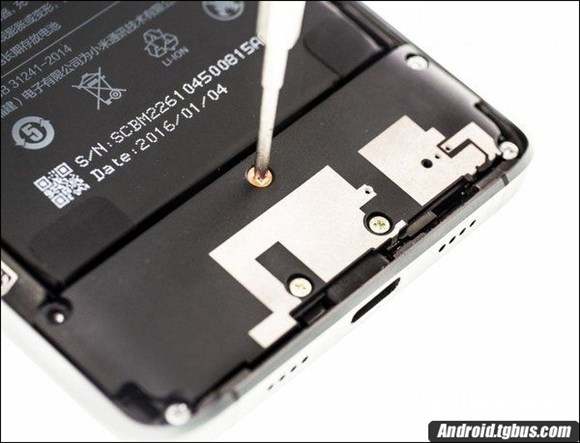 第三步:拆卸内部固定螺丝。轻松拆下后盖后,可以看到小米5内部电池和保护中框,接下来需要将保护中框上的固定螺丝拆卸下来,如图。