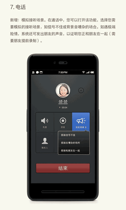 其中电话情景模拟功能可以模拟接听场景,在通话中如果打开该项功能,选择需要模拟的接听场景,如信号不佳或背景嘈杂的场合。如遇极端险情,系统还会自动发出朋友的声音,证明你和朋友在一起(需要朋友提前录制)。