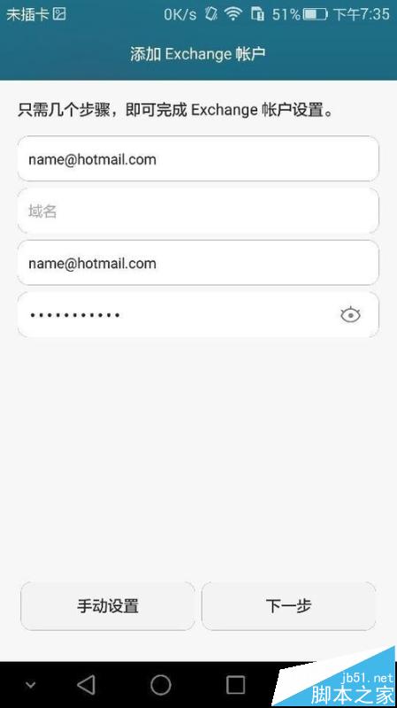 3、其他方法:在设置——账户——公司中,点击账号设置,添加,选择exchange,输入邮箱地址、域名(微软的邮箱,包括Hotmail、outlook、live等,域名可填“m.hotmail.com”、“m.outlook.com”、“mail.hotmail.com”等、”outlook.com“),用户名同邮箱地址一样(写全称),密码填微软登录密码。再选择”“下一步;OK。