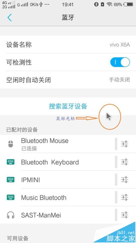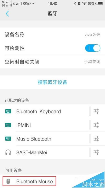 3、点击手机蓝牙功能选项里的“搜索蓝牙设备”,待蓝牙鼠标(Bluetooth Mouse)被搜索出来后,点击蓝牙鼠标名称即可自动完成配对连接。