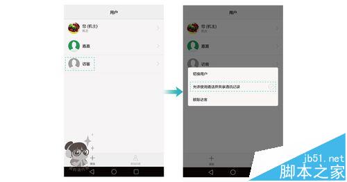4、授权用户使用电话、信息及共享通讯记录,以机主身份登录时,可以对子用户及访客进行授权。点击要授权的用户,在弹出的菜单中点击允许使用通话和信息并共享通讯记录。