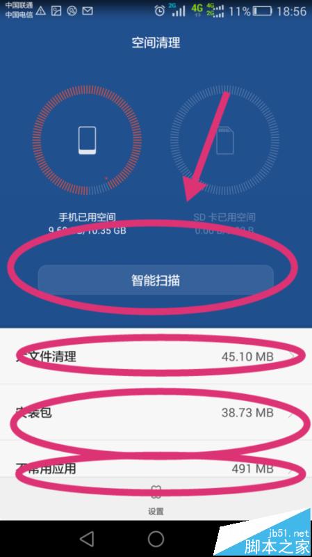 3、点击智能清理选项,这时我们可以看到文件清理,安装包清理及不常用的应用。