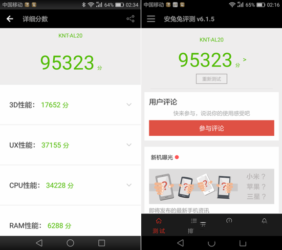 通过安兔兔来测试了一下这款新机的跑分成绩,最终跑分成绩为95323分,我们会发现这和之前的华为P9跑分成绩差不多,没有太大的差距,但跟高通晓龙820跑分还是有差距的,但麒麟955经过多年的积累,性能方面也已经达到了第一梯队的SoC。