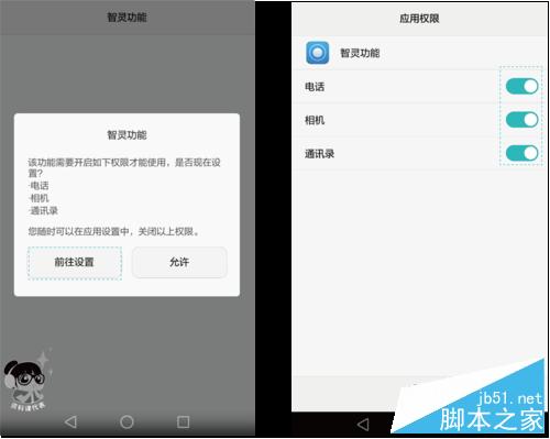 根据屏幕提示点击【前往设置】,打开【电话】、【相机】以及【通讯录】开关,允许智灵功能调用相关数据或信息。