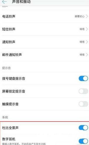五、最后需要提示的是:杜比全景声和数字耳机选项需要打开!在系统【声音与振动】里面开启杜比全景声和数字耳机两个选项开关