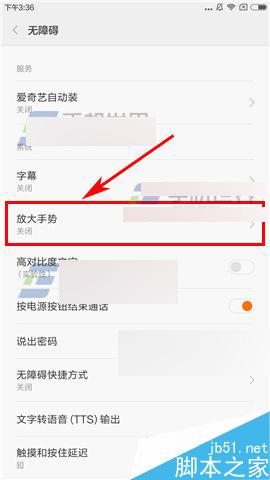 2)接着点击【放大手势】,最后我们再把【开启放大手势】那栏右边的椭圆往右拉打开即可。(如下图)