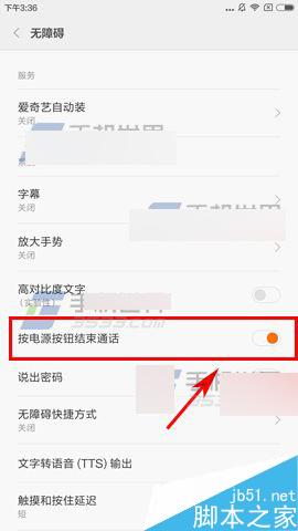 2)最后我们再把【按电源按钮结束通话】那栏右边的椭圆往右拉打开即可。(如下图)