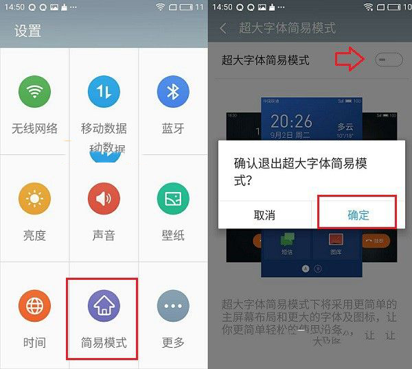方法也很简单,找到并点击进入「设置」-「简易模式」设置,然后关闭简易模式开关,在弹出的确认退出界面模式框中,点击“确定”就可以成功退出简易模式了,如图。