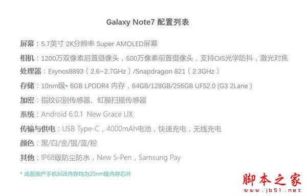 至于搭载的处理器,Note 7将依然是两个版本,一个是Exynos 8893,而另外一个是骁龙821,国内行货版本应该是后者,同时标配6GB内存,除了64GB存储空间外,还有128、256GB(UFS2.0),运行Android 6.0.1系统,同时还提供指纹识别。