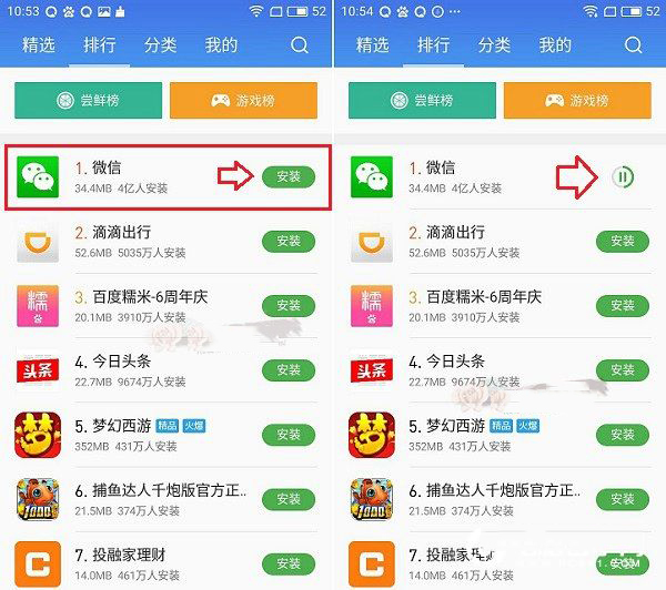 三、这里小编以安装微信为例,切换到排行或者自行搜索找到微信下载界面,然后点击「安装」,之后就可以自动完成微信下载与安装了,如图所示。