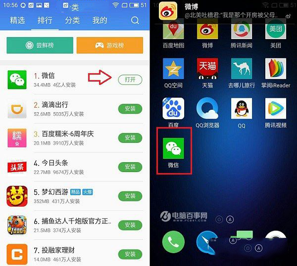 四、等待软件应用安装完成之后,就可以打开了。此外,在魅蓝3S右滑第二屏的桌面也可以看到已经安装成功的微信应用,如下图所示。
