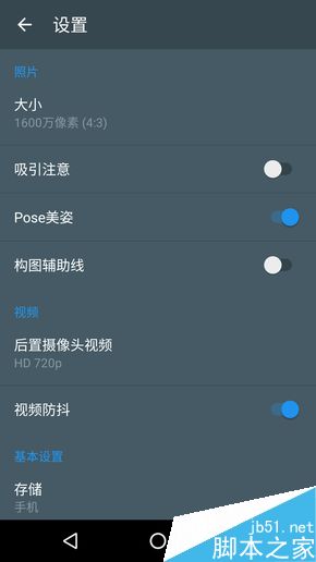 TCL 750拍照界面十分简约,常用的闪光灯、HDR、延时拍摄、夜间模式皆一应俱全。设置中也包括了像素大小、吸引注意、Pose美姿、构图辅助线、快门声音、GPS标记等常用选项。