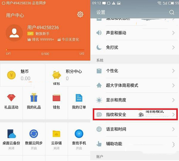 三、注册好账号或者登录后,再次进入魅蓝3S的「设置」-「指纹和安全」设置,如下图所示。
