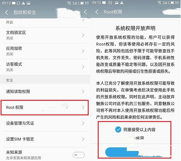 四、在登录Flyme账号的情况下,在指纹和安全设置底部,就可以找到 ROOT 选项了,点击「root权限」,并在接下来的提示界面中,勾选上「同意接受以上内容」,并点击下方的「确定」,如图所示。
