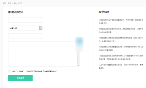 2、然后到这个网站上 http://www.miui.com/unlock/ 申请解锁,然后要填写 姓名、手机号、申请理由 并勾选《小米手机解锁协议》,填写手机接收到的验证码