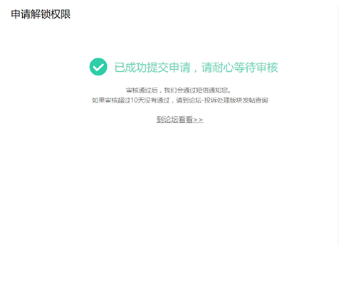 3、申请提交成功,等待审核(一般审核比较快,几乎申请就能通过,节假日时间会比较长),申请解锁通过后,就得真的去解锁了,接下来,你就得用电脑进行红米Note3的BL解锁。