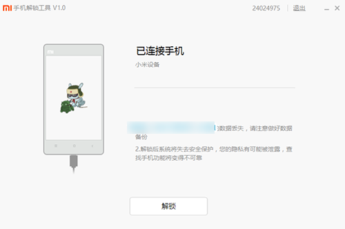 5、接着让你的红米Note3完全关机后,同时手机在关机的状态下长按手机的“音量减少键 + 电源键”,两键同时按住不要松,进入红米Note3的Fastboot模式(有个兔子的界面就是了),(手机系统必须为MIUI开发版,稳定版无法解锁),然后数据线插入手机和电脑联机,点击“解锁”