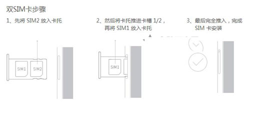 1、先将SIM2放入卡托; 2、然后将卡托推进卡槽1/2,再将 SIM1 放入卡托;