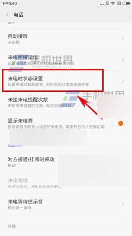 2)接着点击【来电时状态设置】,最后再将【拦截骚扰电话】那栏右边的椭圆往右拉打开就可以了。(如下图)