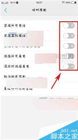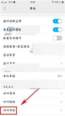 2)打开后点击【呼叫限制】,最后根据实际情况打开或关闭相关选项就可以了。(如下图)