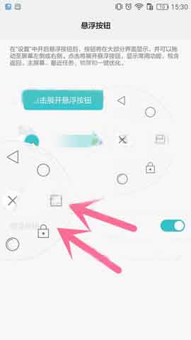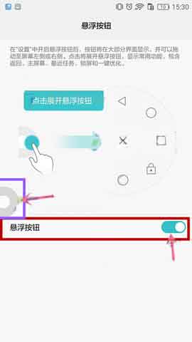 2)接着将开关打开,打开后就会有小白点出来了,点击小白点,即可有相应的功能,例如点击三角形图标可以返回上级界面或退出应用程序。点击圆形图标可以返回主屏幕。点击方形图标可打开最近使用的应用程序列表。点击锁样图标可锁定屏幕。点击双层圆形图标可清理手机内存,并关闭后台耗电的应用程序。点击叉形图标可收起菜单。拖动悬浮按钮还可随意调整位置哦!(如下图)