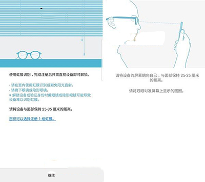 二、看看虹膜识别免责声明之后,按照提示就可以开始设置了。在设置虹膜识别之前,需要注意2个事项: