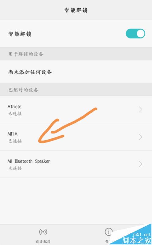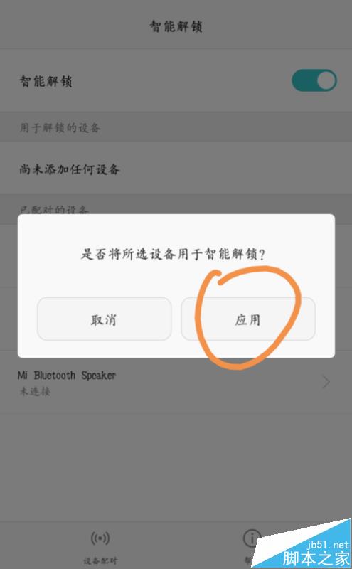 3、在已配对的设备中选择你的小米手环并点击应用。到这里,智能解锁设备设置完成,接下来开启手机智能解锁