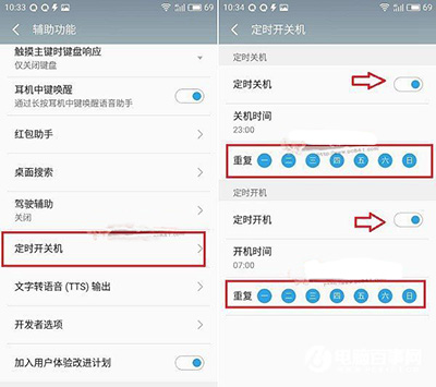 第二步:在辅助功能中下拉找到「定时开关机」功能,默认是关闭的。如果需要使用,则将定时关机或定时开机开启,然后按照自己的需要,选择定时开关机的时间与重启,如图。