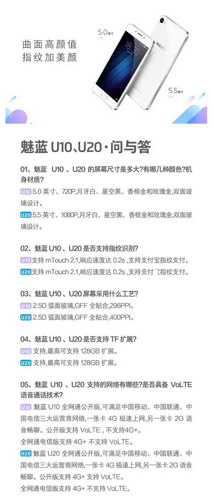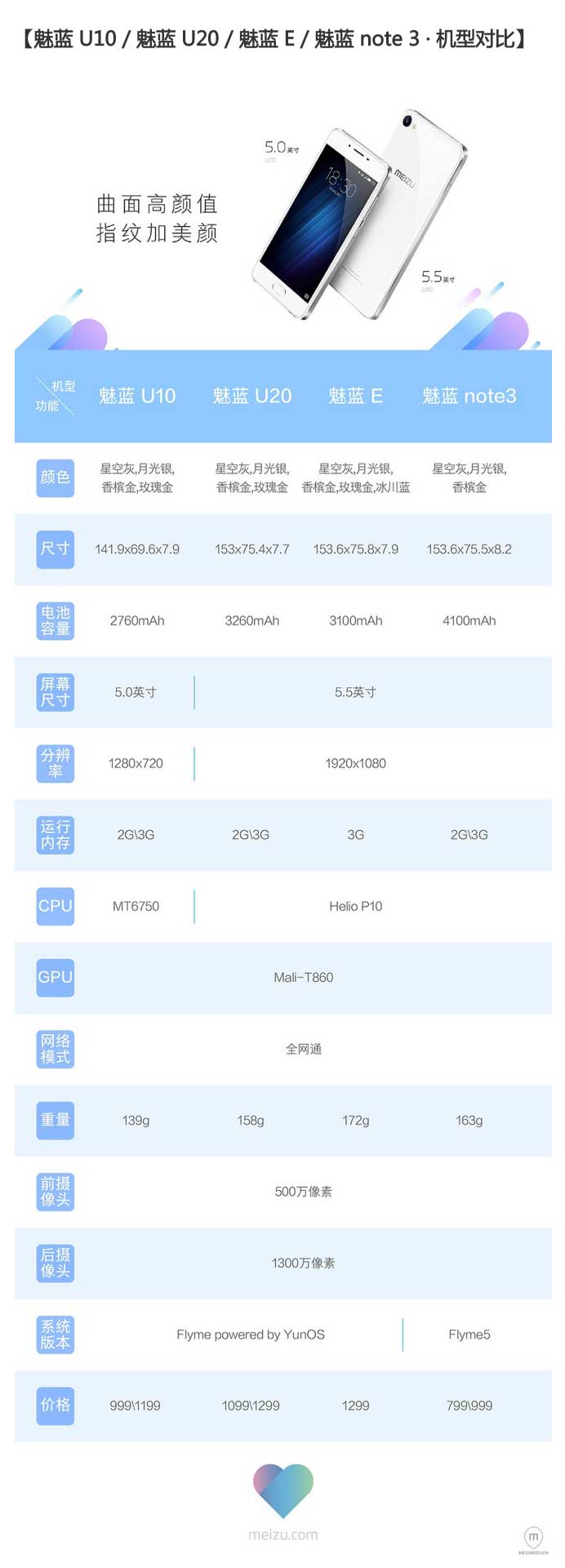 配置方面,魅族U10采用5英寸全贴合的1080P屏幕,搭载联发科MT6750八核处理器,配备2GB+16GB/3GB+32GB存储组合,内置2760mAh电池容量,支持双卡双待,支持全网通4G。魅族U20采用5.5英寸全贴合1080p屏幕,搭载联发科P10处理器,主频可达1.8GHz,主频可达1.8GHz,配备2GB+16GB/3GB+32GB存储组合,内置3260mAh电池容量,支持双卡双待,支持全网通4G。