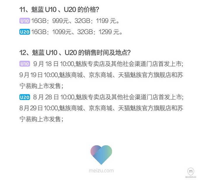 售价方面,魅蓝U10手机2GB+16GB版售价999元,3GB+32GB版售价1199元元,9月18日线下渠道发售,9月19日10:00魅族官网线上开卖。魅蓝U20手机2GB+16GB版售价1099元,3GB+32GB版售价1299元,8月28日10:00线下发售,8月29日10:00线上开卖。