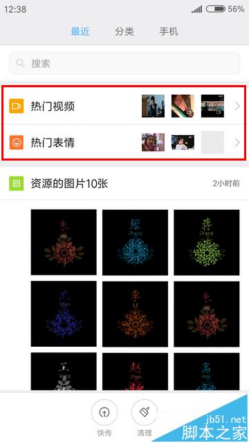 1、在默认情况下,当我们打开MIUI中的“文件管理”并切换到“最近”选项卡时,在页面顶部首先展现的便是“热门视频”和“热门表情”。