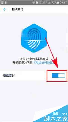 2)在安全设置里面点击【指纹】选项,接着在指纹支付界面,把【指纹支付】的开关打开,打开以后就开启了支付宝的指纹支付,以后在支付宝里面支付只需要验证指纹就可以了。(如下图)