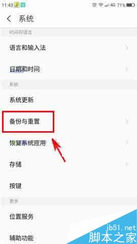 1)首先我们先打开【设置】,然后找到【系统】,打开后我们再点击【备份与重置】。(如下图)
