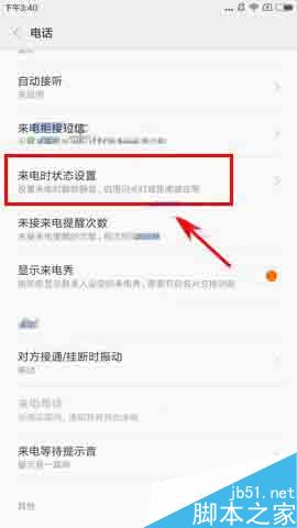 2)接着点击【来电时状态设置】,最后我们再把【来电闪光灯】那栏右边的椭圆往右拉打开即可。(如下图)
